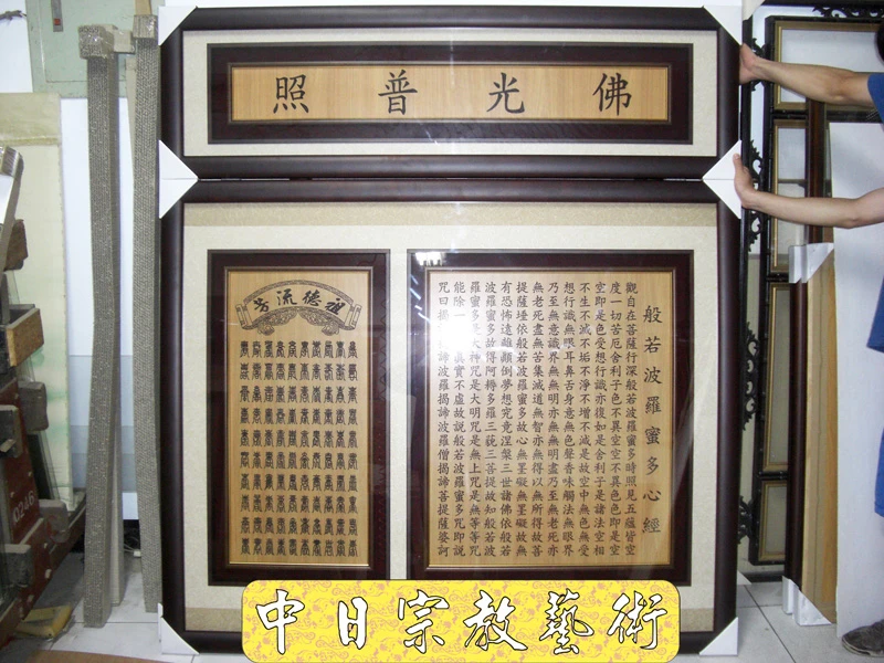 掛聯尺寸寬5尺1*高4尺2 橫批尺寸寬5尺1*高1尺5 (另可分開購買) 經文木雕聯系列~心經百壽經文雕刻+佛光普照雕刻橫批 備有各式像框與底布種類 樣式齊全